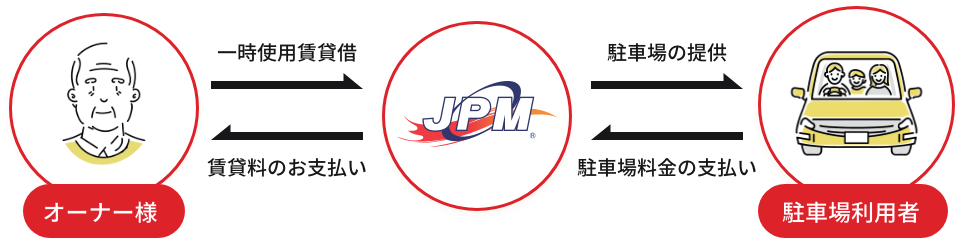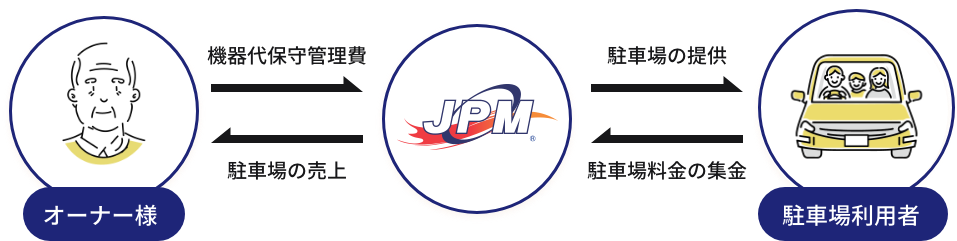 駐車場借り上げにより、毎月一定の賃料をお支払いいたします。JPMは機器、メンテナンスともに自社対応のため、費用を抑えながら高額賃料を実現します。